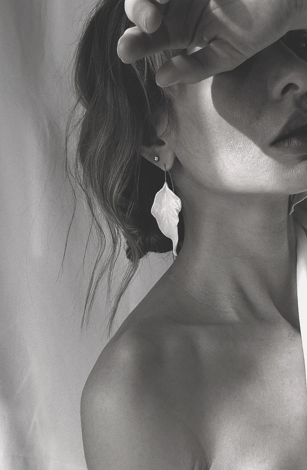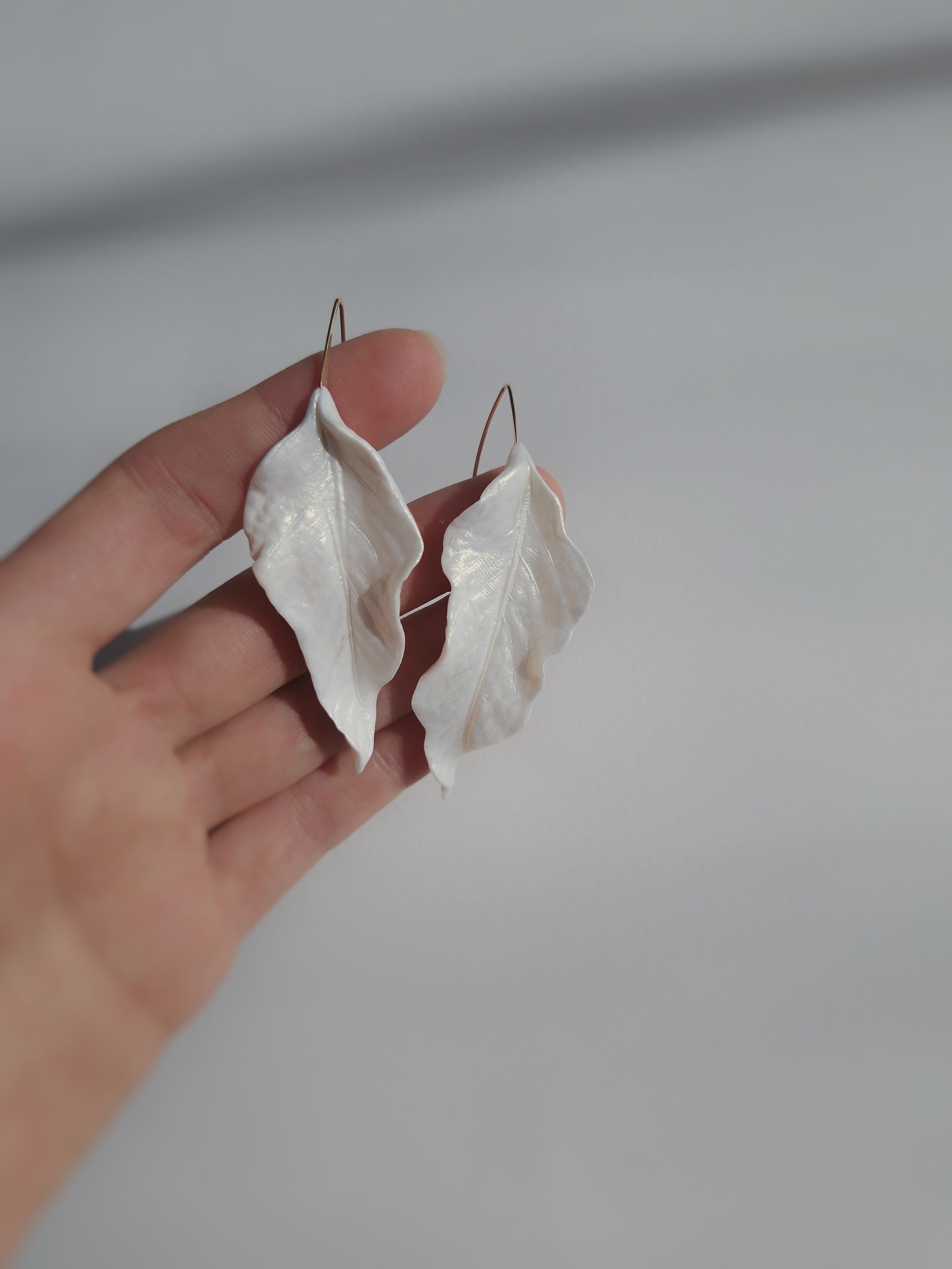Add a touch of natural elegance to your look with these handcrafted white leaf earrings. Featuring a delicate, hanging leaf design with a subtle pearl finish, these earrings are the perfect blend of sophistication and simplicity.