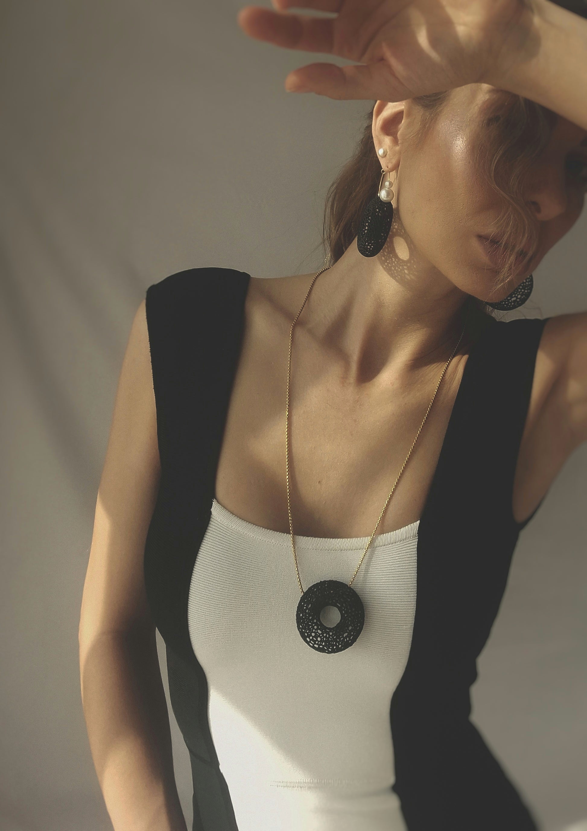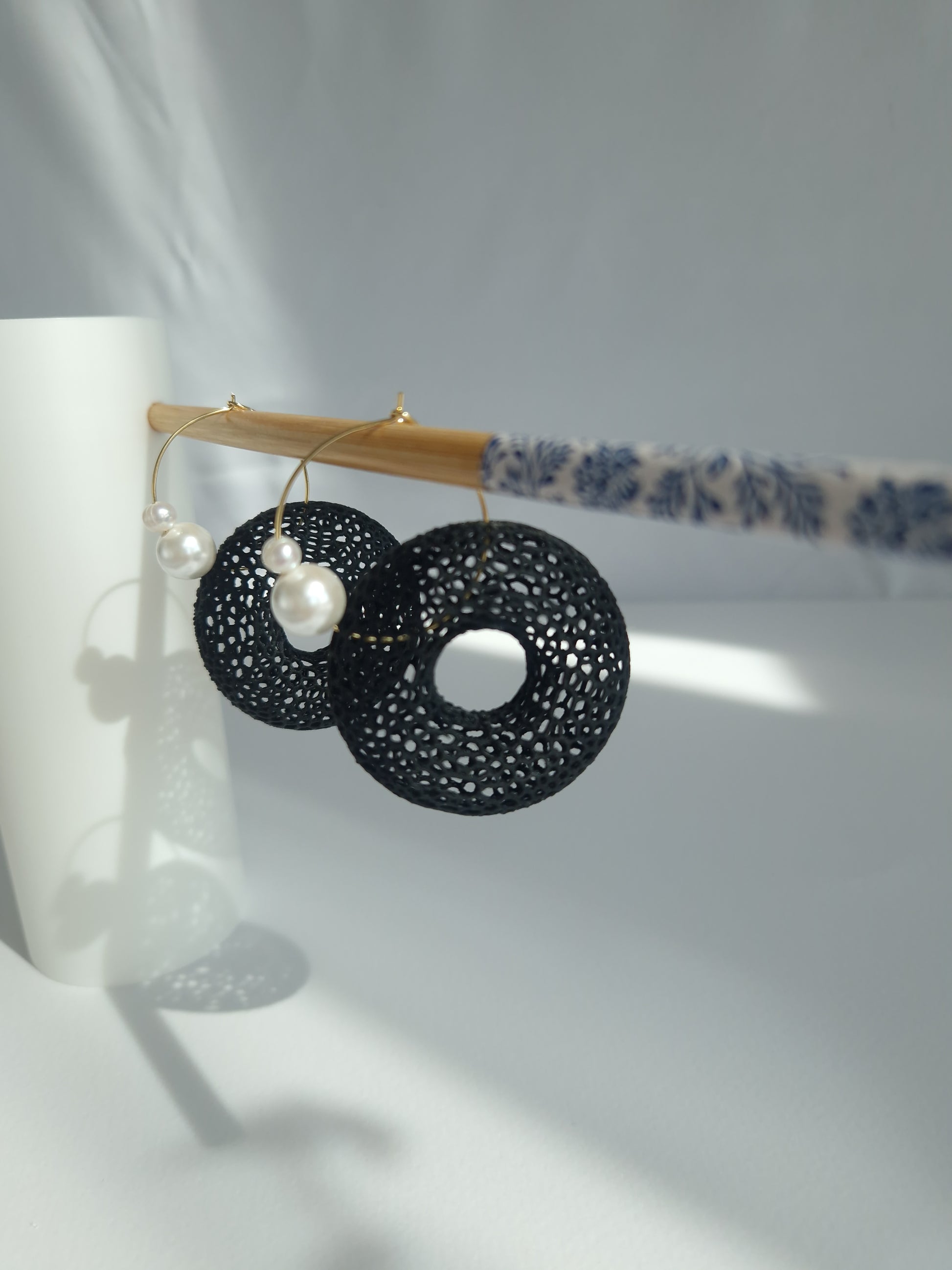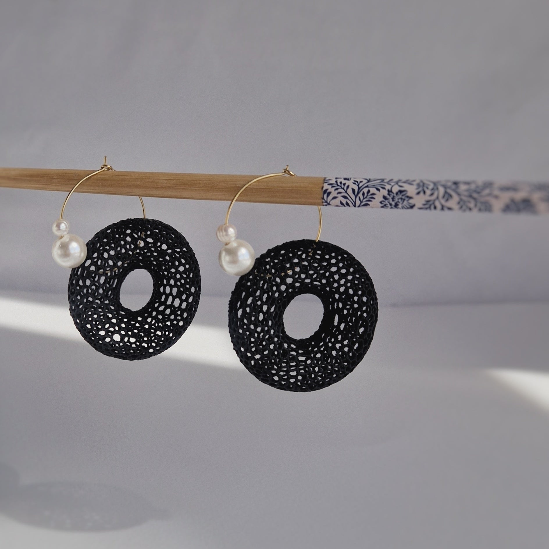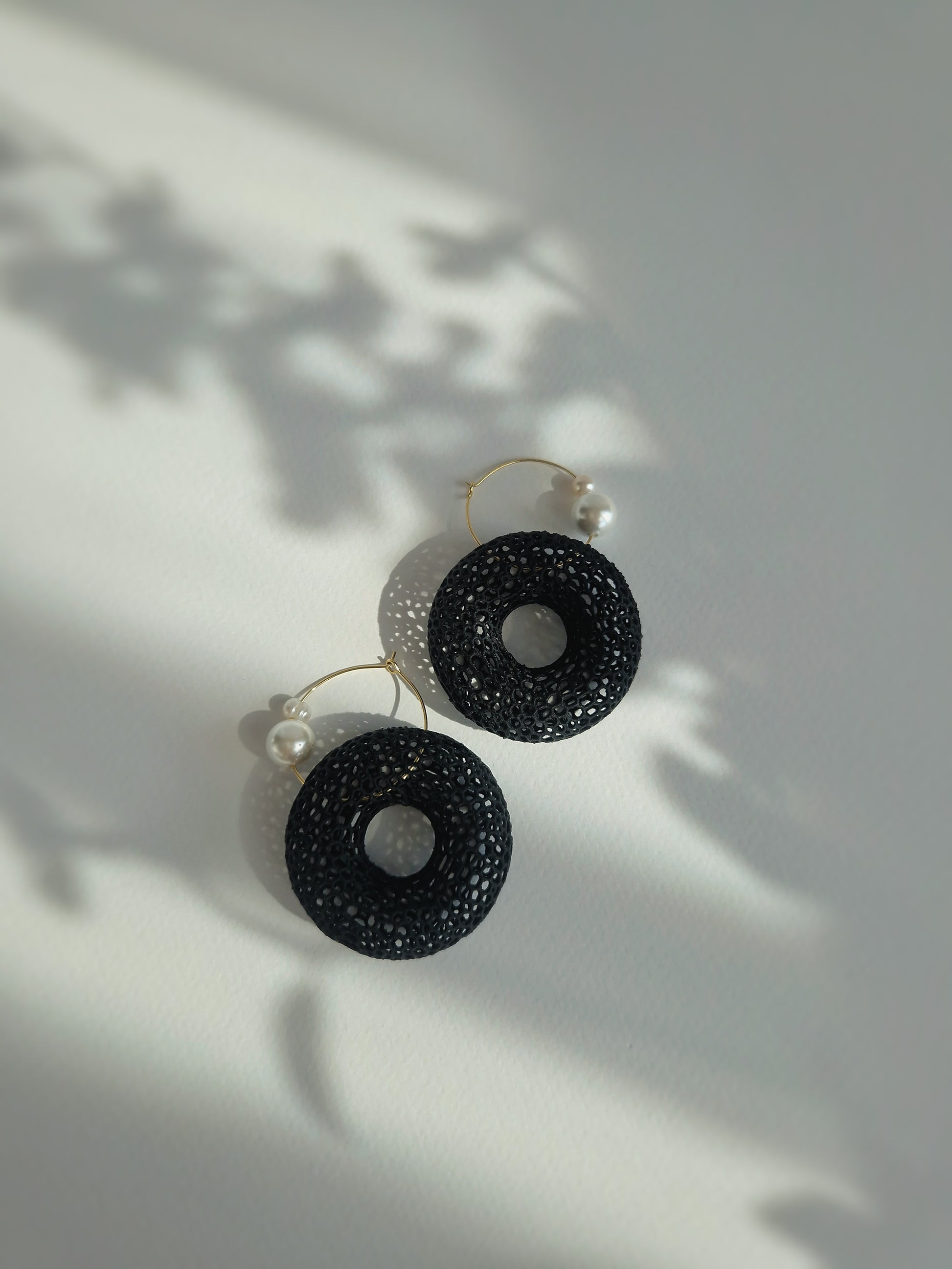 Make a bold yet delicate statement with these handcrafted hoop earrings, featuring a unique three-dimensional lace-like donut shape adorned with pearls. The intricate mesh design creates a voluminous look, while remaining feather-light for effortless, all-day comfort.