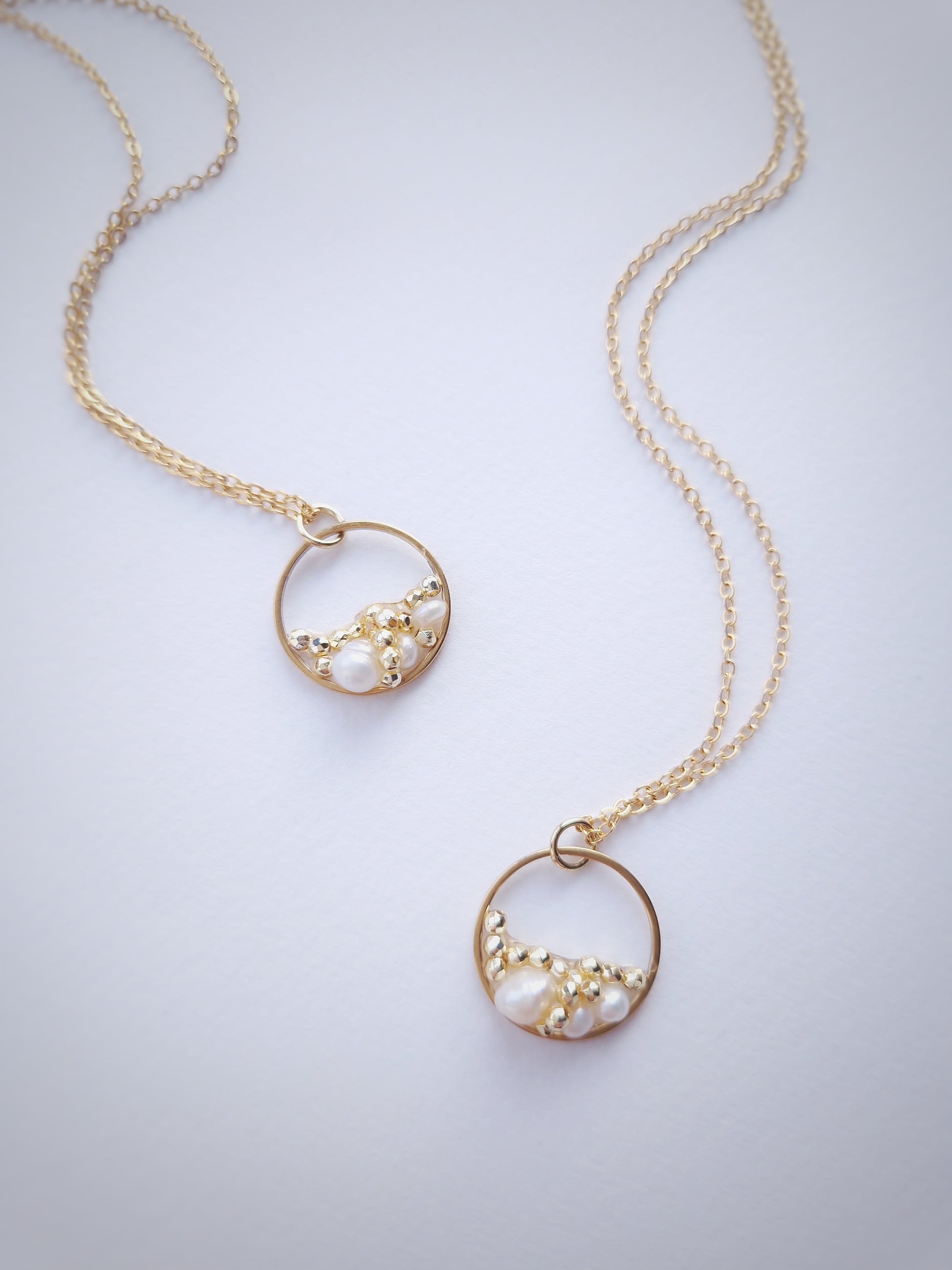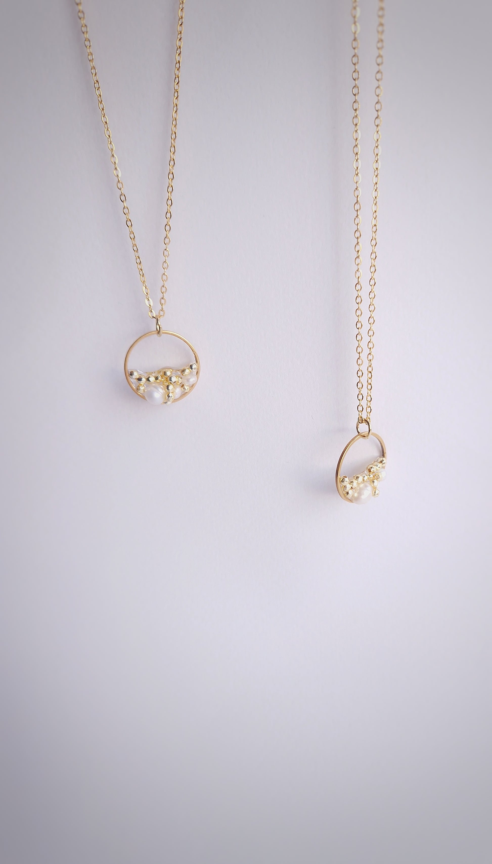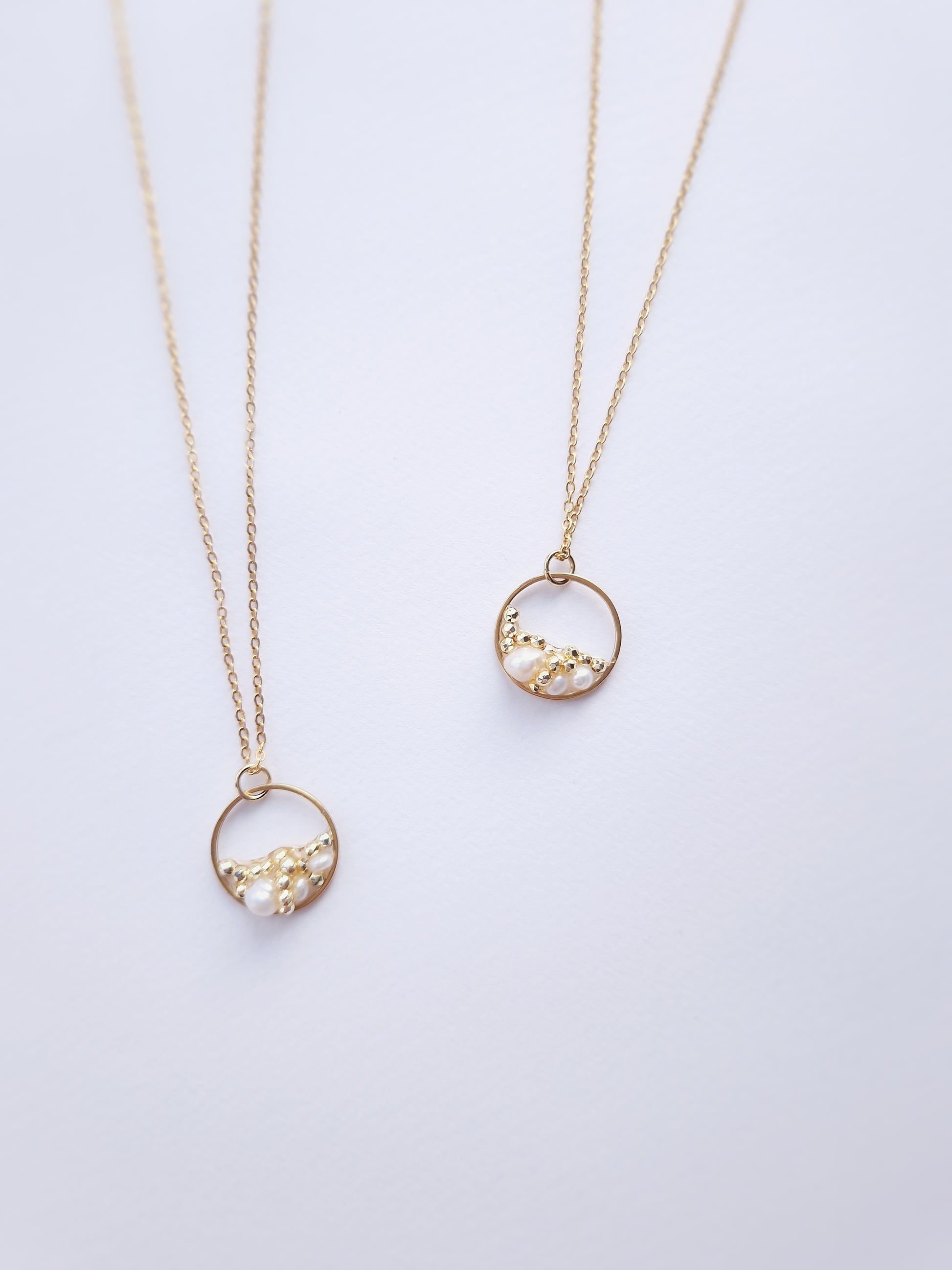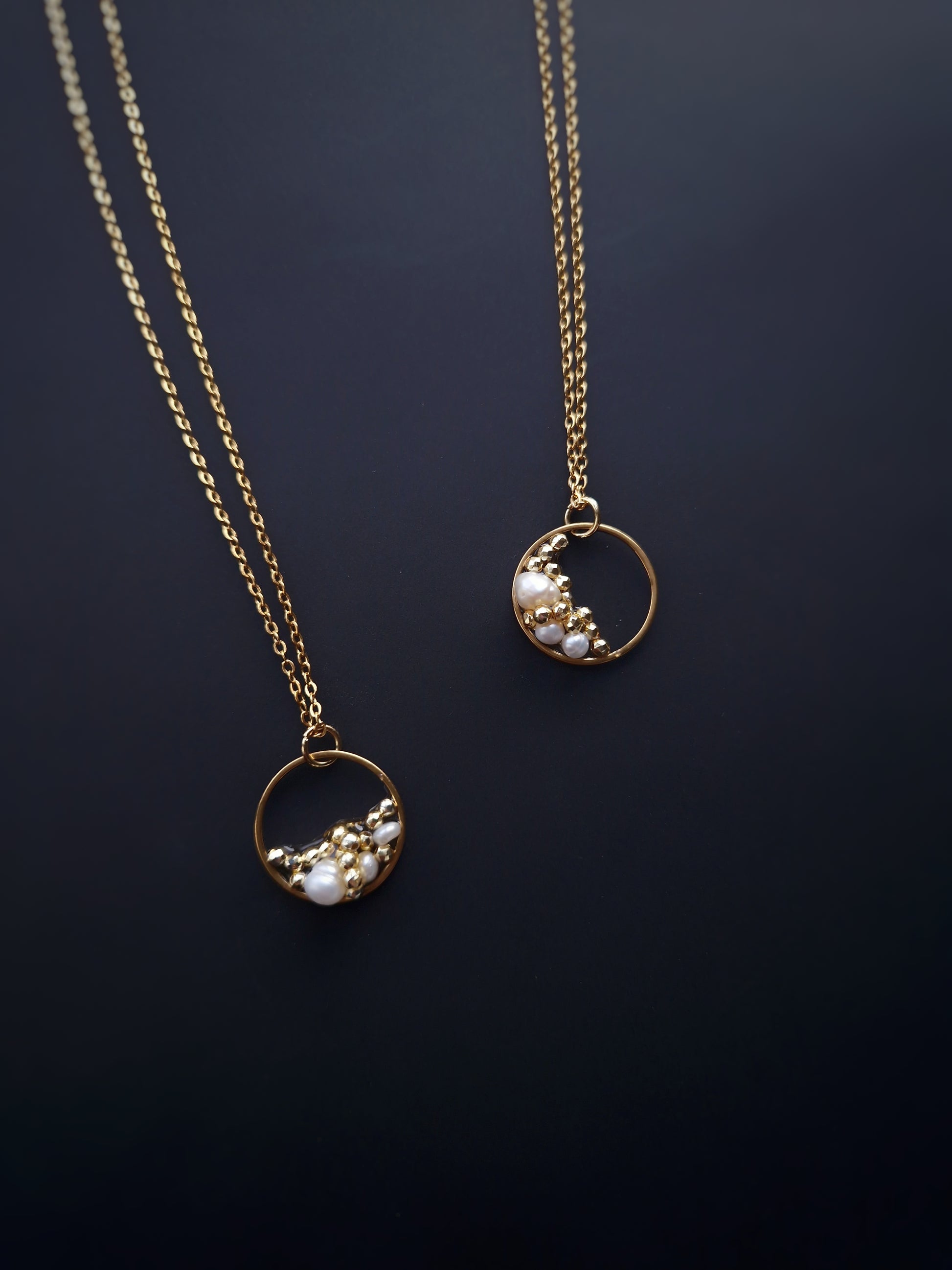 This delicate handmade necklace features a fine 46 cm stainless steel chain, holding a unique round pendant inspired by the phases of the moon. The circle is artfully half-filled with shimmering faceted hematite stones and soft, luminous pearls, symbolizing the balance between light and shadow, feminine energy, and transformation.