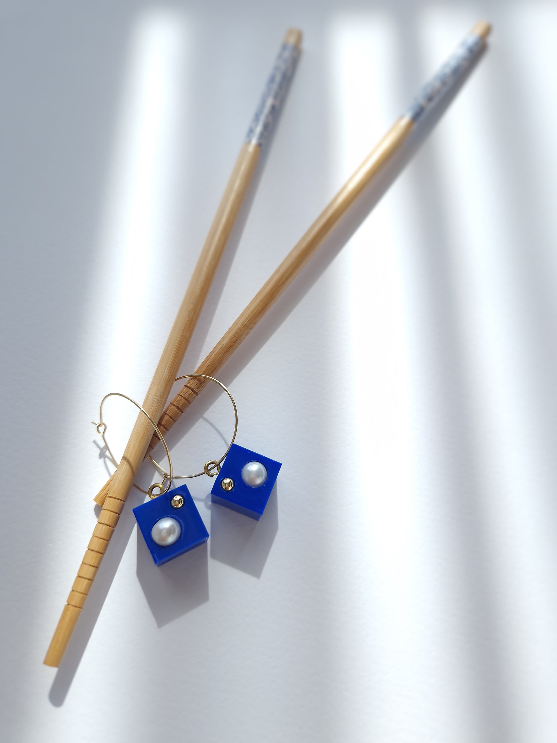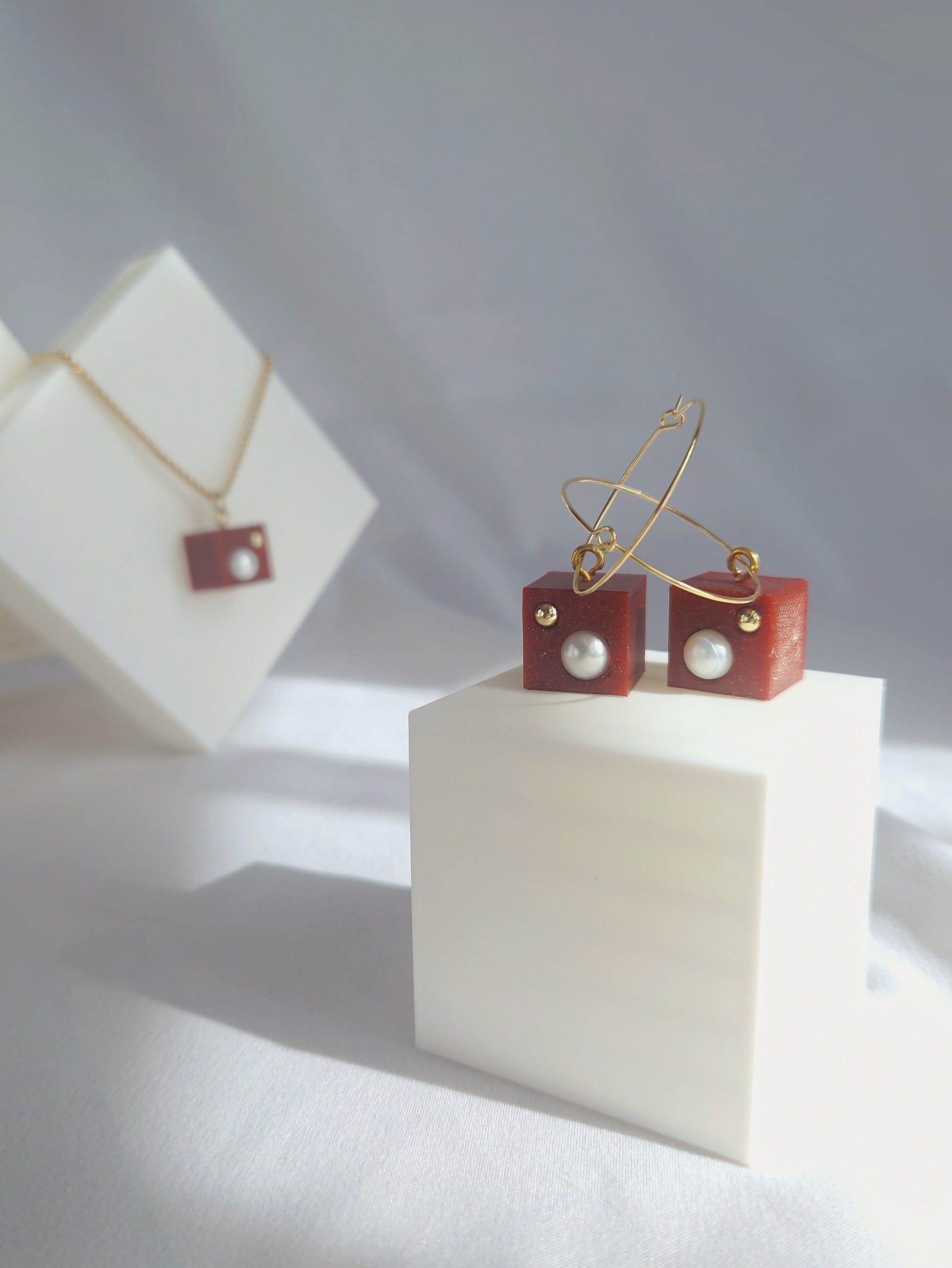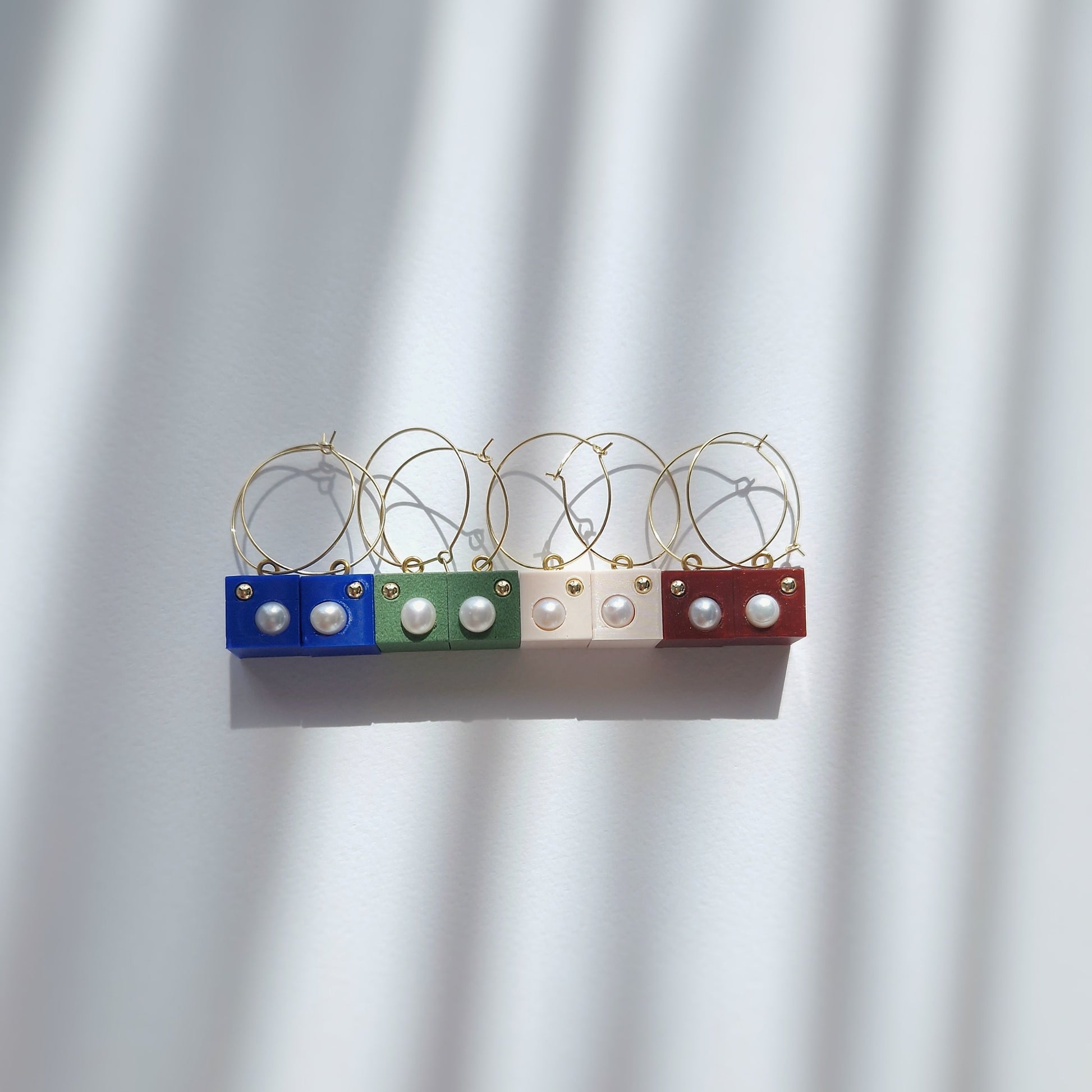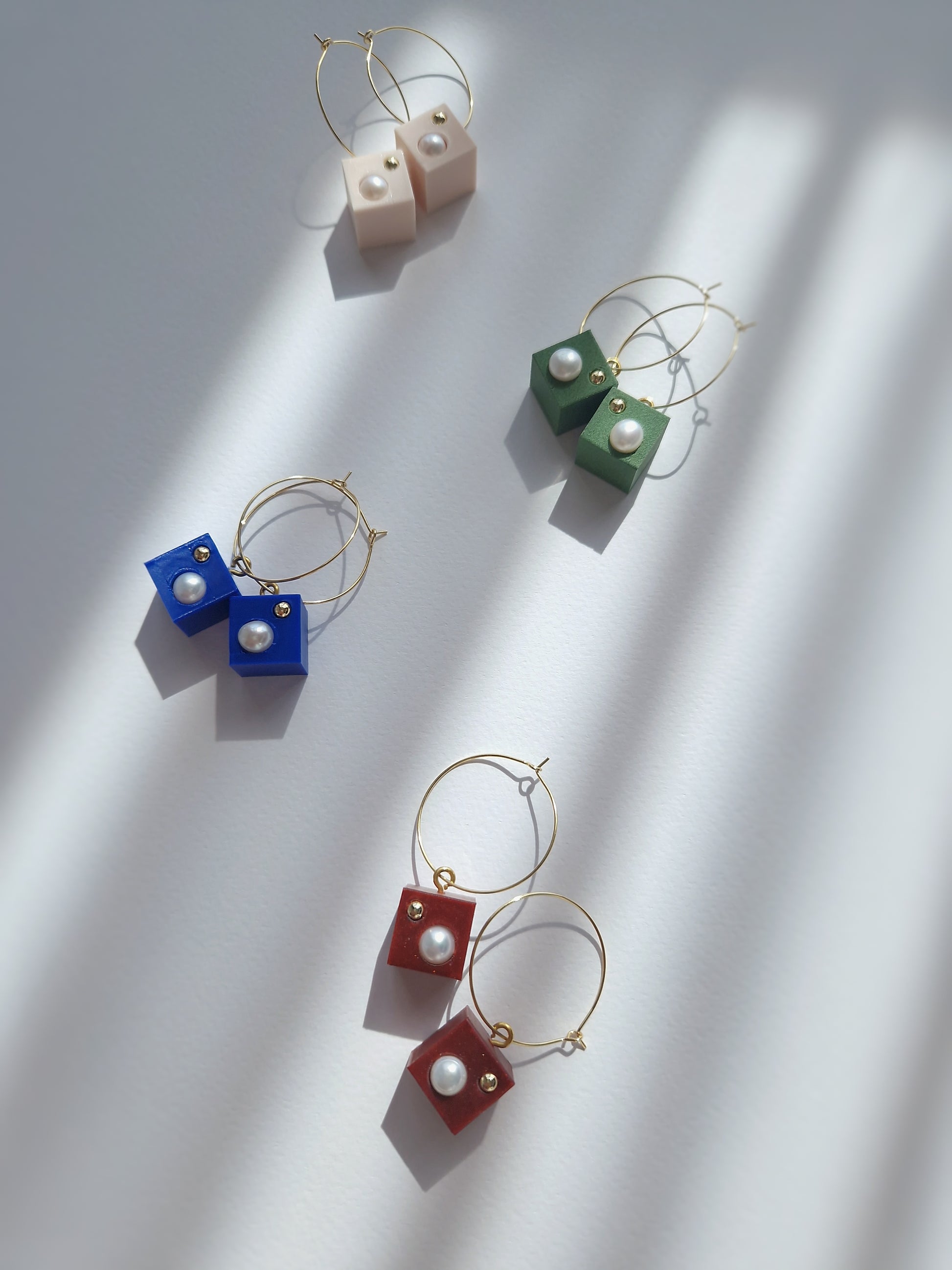 Elevate your style with these unique hoop earrings featuring a striking abstract cube pendant inspired by the playful shape of a dice. Suspended from elegant hoops, each cube reveals a hidden surprise — a natural pearl embedded within, adding a soft contrast to the bold geometric form. Finished with a refined gold accent, these earrings blend modern design with organic beauty.